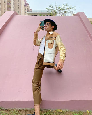 "A little bit cowboy, a little bit cool 💛 I decided to chill in the SICKEST FS jacket- upcyled using luxury shopping bags. ."– Siddharth Batra
