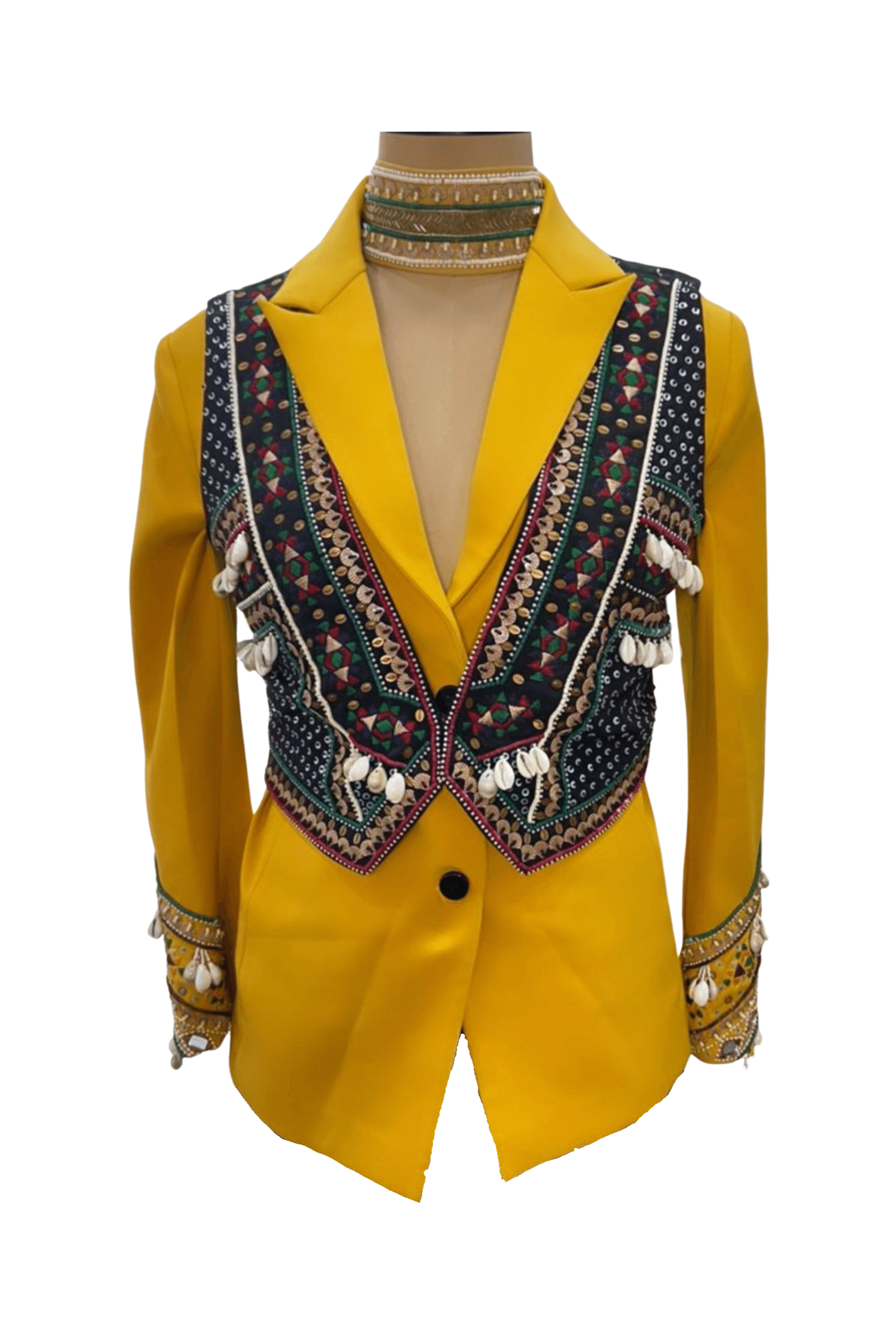Expertly crafted and stylish, our Boho Embroidered Blazer and waistcoat set adds a touch of sophistication to any wardrobe. Made with high-quality mustard fabric and intricate embroidery details, this set is perfect for adding a pop of color and personality to your outfit. Elevate your fashion game with this must-have piece.