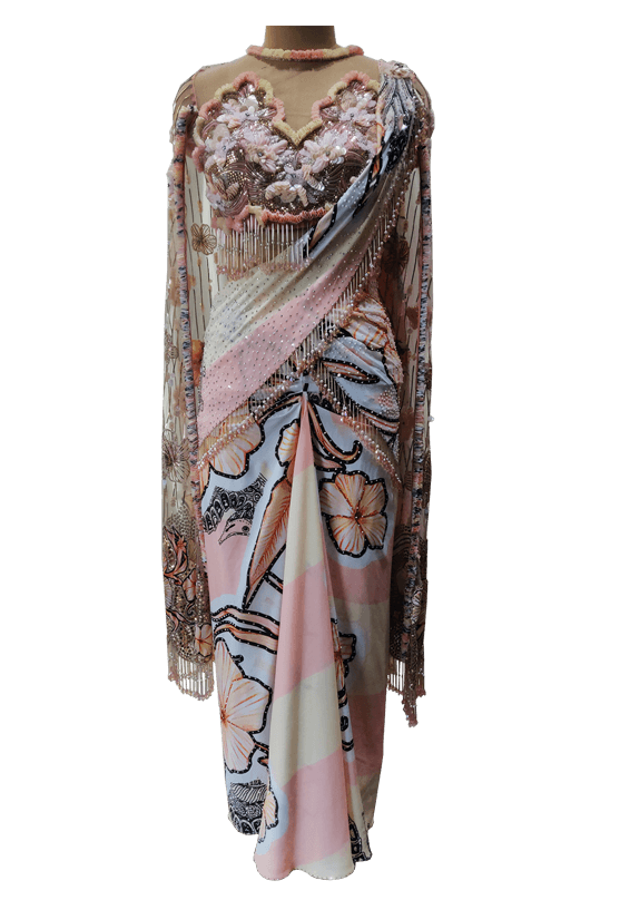 The Peach Seahorse Printed Saree Set is a captivating fusion of playful aesthetics and intricate detailing. The seahorse-printed saree introduces a whimsical touch, while the cutwork, heavy-embroidered cape blouse adds a layer of sophistication. This ensemble is perfect for those who appreciate a balance of contemporary design and traditional craftsmanship, making it an ideal choice for special occasions or cultural celebrations.