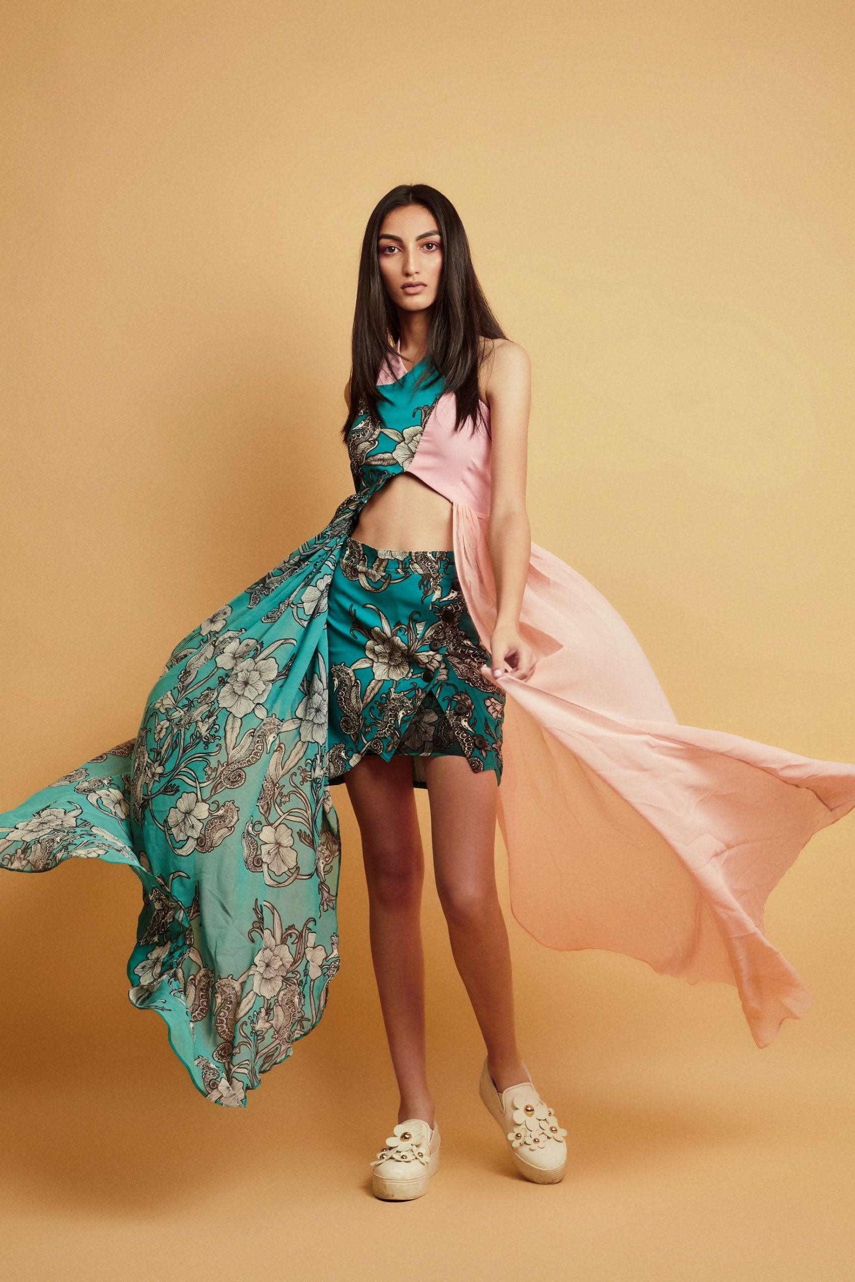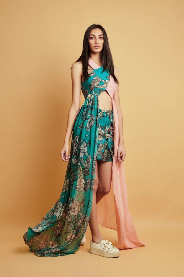 This Cross-Over Halter Long Drape Top is crafted with a blend of georgette lycra and georgette fabric for a flattering fit and stylish look. The top features a blush pink and teal seahorse-printed design, perfect for both formal and casual occasions.