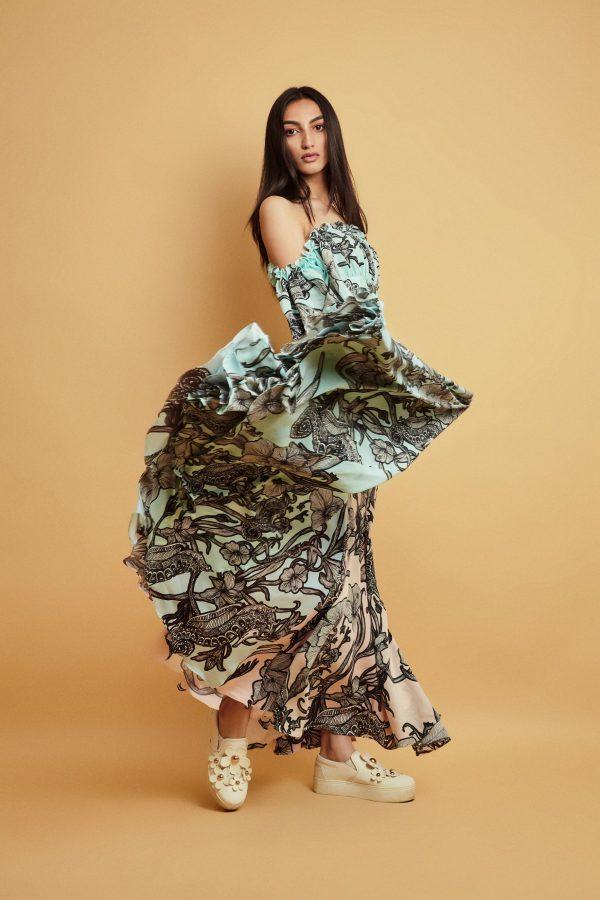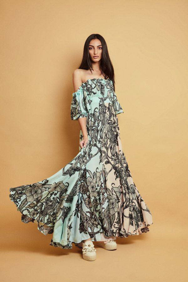 Look beautiful and stylish with our Off-Shoulder Seahorse Maxi. Crafted with Georgette Lycra, this off-shoulder maxi comes in a combination of blush pink and powder blue with an attached semi-crepe lining, giving you a graceful and elegant look.