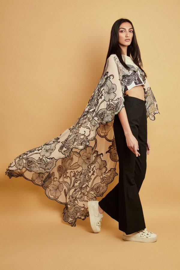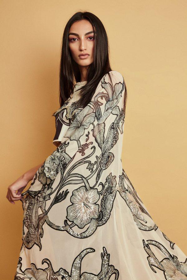 Elevate your ensemble with this breathtaking Seahorse Scalloped High Low Cape. Crafted from luxurious pure silk georgette in a vivid blush pink hue, the cape features intricate hand-cut silver foil detailing and a beaded fringe sequin neckline for a touch of sparkle. Perfect for any special occasion.