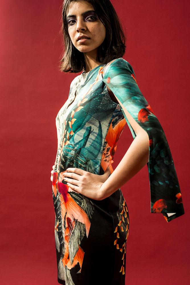 Take your wardrobe up a notch with this eye-catching Fish Print Dress. Featuring a classic dress silhouette with relaxed fit and slit sleeves, this dress is made from high-quality materials for comfort and durability. With an all-over fish print, this stylish piece is versatile enough for both casual and dressier occasions. Layer it on cooler days to make a statement.