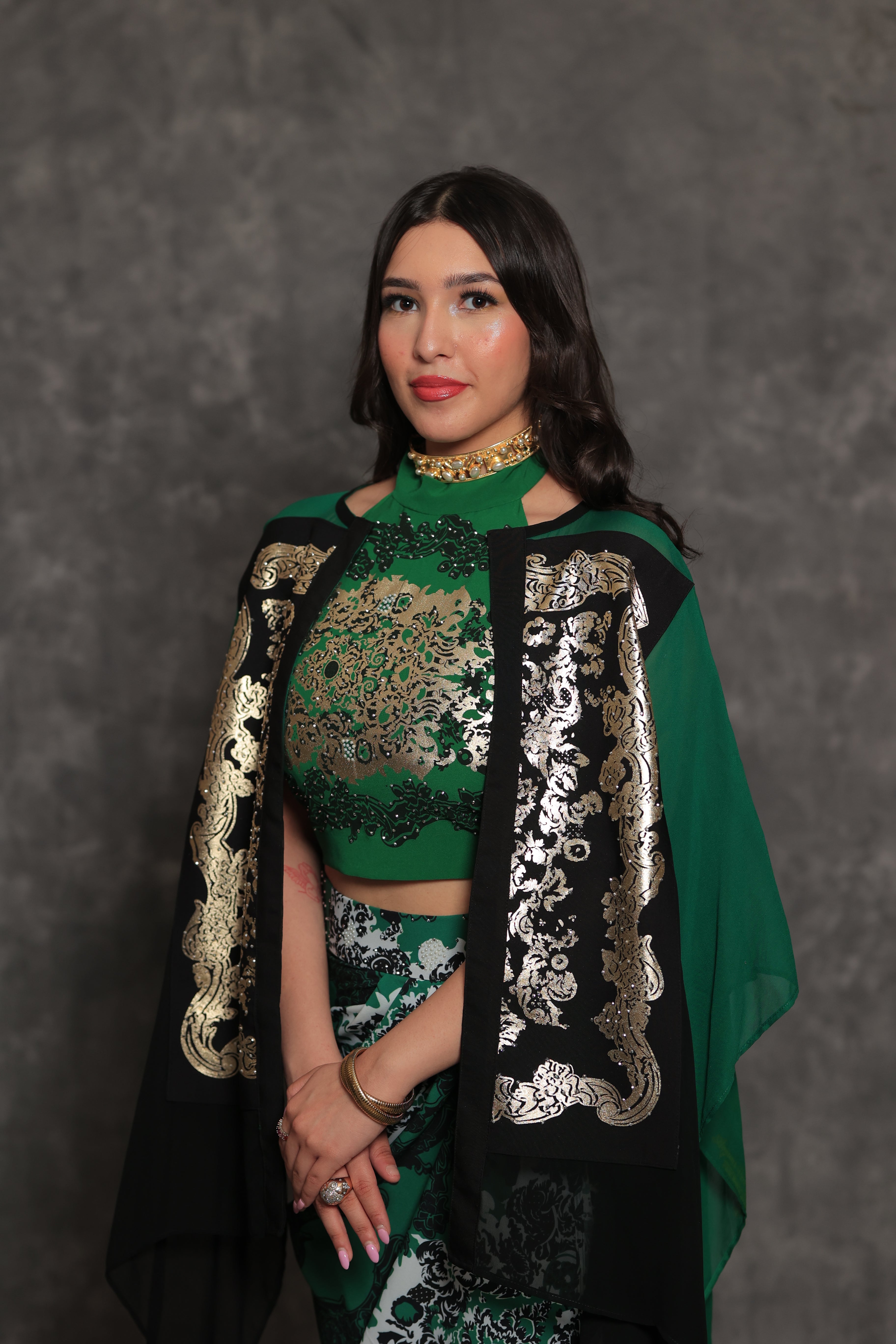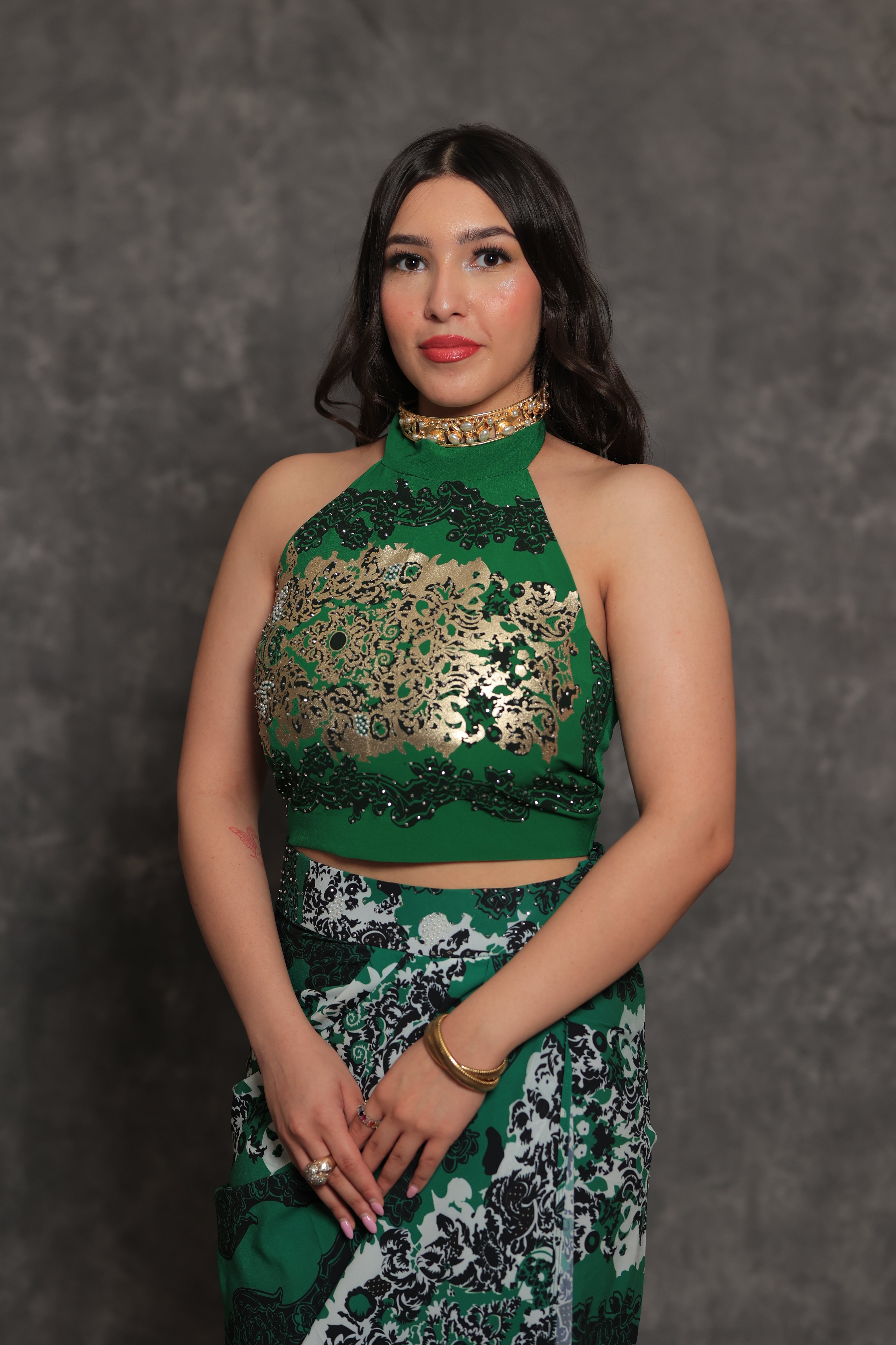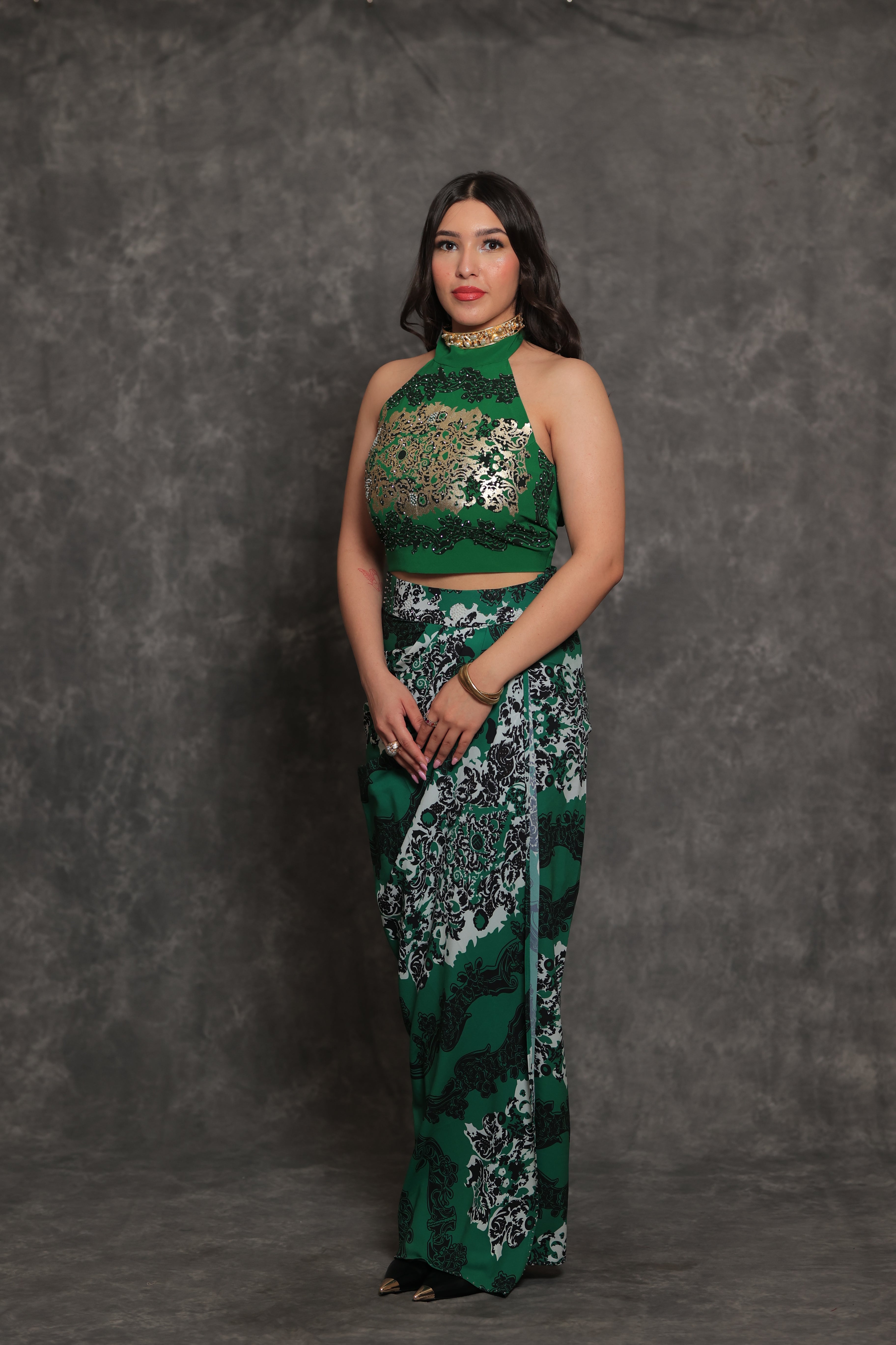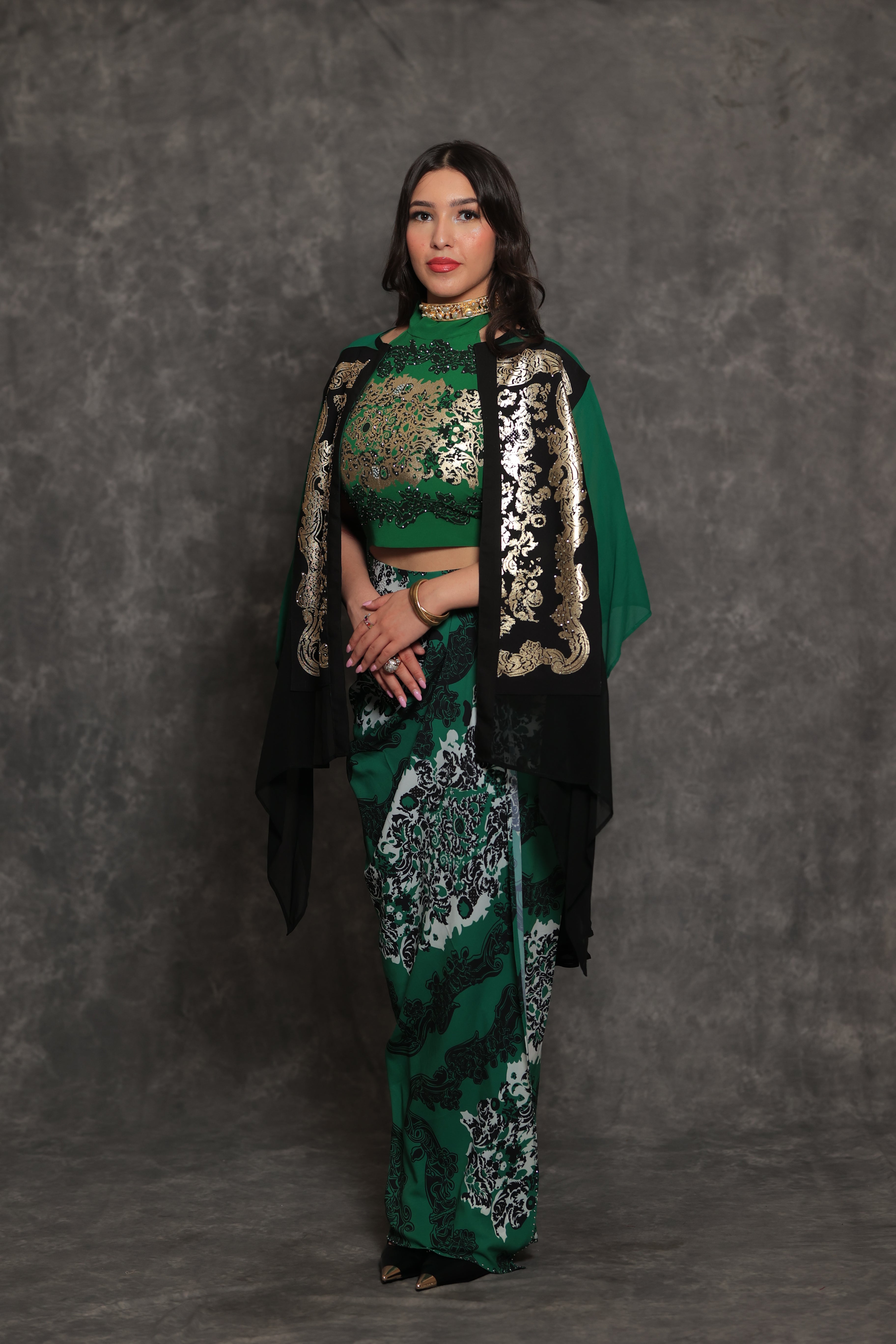 Introducing our stunning Foil Printed Emerald Green Dhoti Cape Set! Made with an exquisite halter design and featuring a beautifully draped dhoti and cape, this set will make you stand out in any occasion. The foil printing adds a touch of luxury, perfect for those who want to make a statement. Order now and elevate your wardrobe to new heights!
